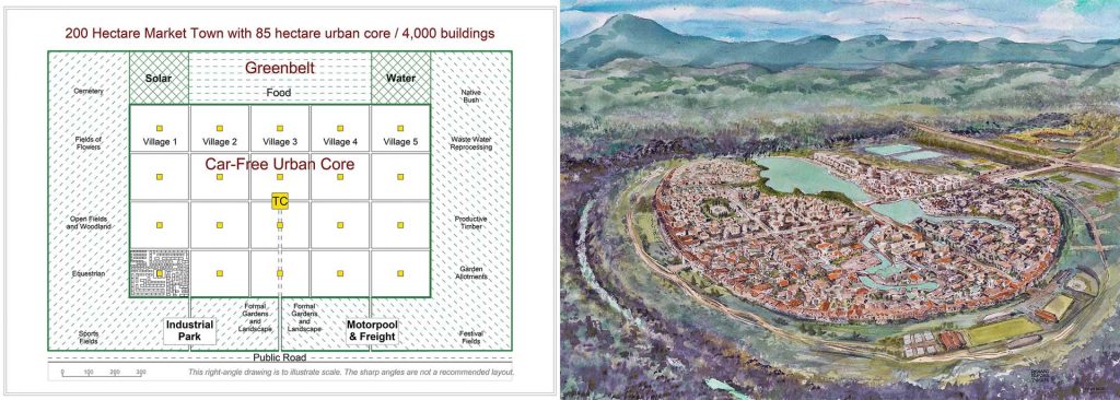 Greenbelt: The urban core works on about 85 hectares, but the plan calls for 200, with over 55% of the land as a surrounding greenbelt so all the neighbours will see is a belt of trees. No lights, no noise, no urban activity. Further, the greenbelt will contain its own solar array, rainwater harvesting and wastewater treatment plant so there will be no digging up the access roads for utility services.